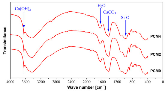The FTIR analyses of cement mortar containing 0.6% and 2.0% PVA were conducted after 28 days of curing, and the spectra are shown in Figure 10 for comparison. As shown in Figure 10, all curves have obvious characteristic peaks at 3643, 1643, 1452, and 973 cm-1. The absorption peak near 3643 cm-1 corresponds to the characteristic peak of free hydroxyl in the Ca(OH)2 molecule produced by cement hydration. The characteristic absorption peak of Si-O of C-S-H of cement hydration products is at near 973 cm-1. The peak at 1452 cm-1 corresponds to the stretching of CaCO3. The FTIR spectra of PCM2 containing 0.6% PVA shows more intense absorption peaks at 973 cm-1 as compared to CM, indicating the positive effect of PVA on accelerating the hydration rate of the cement matrix. However, this peak of PCM4 was much lower than that of PCM0, indicating the excessive addition of PVA impacted the hydration of the cement matrix in a negative way. Moreover, Figure 10 shows that the addition of PVA reduced the spectral data at 3643 cm−1, which corresponds to the -OH band of Ca(OH)2. This result coincides well with the results of DSC.