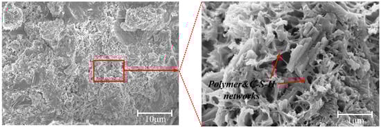 Scanning electron microscopy is an important means of analyzing the internal microstructure of materials. Scanning electron microscopy images can be used to determine the composition of the pore structure inside the cement matrix, the internal shape of the cement matrix and the type of hydration products. Figure 11 shows the microstructure of the modified mortar with a PVA content of 0.6% for 28 days of curing. As shown in Figure 11, the internal structure, pore distribution, and pore size composition of the modified mortar changed with the incorporation of PVA. The polymer was evenly distributed in the cement matrix while the cement mortar was being agitated and intertwined with the cement hydration product. As the cement hydration reaction progressed, the polymer continuously precipitated in the cement to form a polymer film. The presence of these films can play the following roles: (1) The films can combine with the hydration product to enhance the connection between the hydration products, thereby improving the mechanical properties of the cement mortar. (2) Part of the film can become interspersed with the cement base. Between the pores, it can fill the pores and form bridges in the cement plate. Under a load, it can absorb the energy generated by the external force so that the mechanical properties of the cement matrix are improved [23]. (3) The presence of the polymer can refine the pores, making a large number of harmful pores decrease into medium-sized or even harmless pores, thereby enhancing the mechanical properties of the cement mortar. In addition, it can be clearly observed in Figure 11 that the polymer film spans the crack between the cement plates to form a load transfer bridge. Under the action of an external force, the film is torn, and the energy generated by the external load is absorbed so that the crack generation and development process of the cement plate are delayed.
