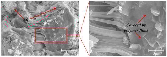 Figure 13 is the SEM image of PCM4 containing 2.0% PVA. Figure 13 shows that the morphology and microstructure of PCM4 are quite different from PCM2. The excessive incorporation of PVA led to the formation of heave polymer sheets within the cement matrix. These heavy PVA film might coat cement particles and prevent them from having contact with water. This coated effect of PVA might delay the hydration rate of cement, as demonstrated by DSC and FTIR test results as shown in Figure 9 and Figure 10. The lower compressive strength of PCM4 over PCM0 might be due to its lower hydration rate caused by the coated effect of PVA. In addition, Figure 13 shows the positive effect of PVA on bridging cracks, which lead to the increase of flexural strength of mortar as shown in Figure 6, where the three-day flexural strength of PCM4 was about 36.6% and 1.8% higher than that of PCM0 and PCM2, respectively.