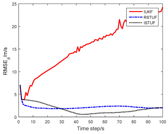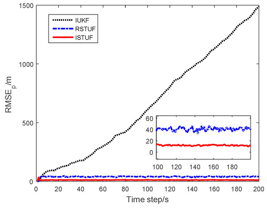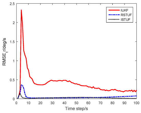The RMSEs of the estimating results are shown in Figure 6, Figure 7 and Figure 8. The figures indicate that the RMSE of IUKF had been divergent, i.e., the enlarged heavy-tailed noise seriously affected the performance of filters under GF framework. The RMSE of RSTUF was also larger than that of ISTUF obviously. As the probability of time-delayed measurement had increased, the effect of the phenomenon was aggravated.