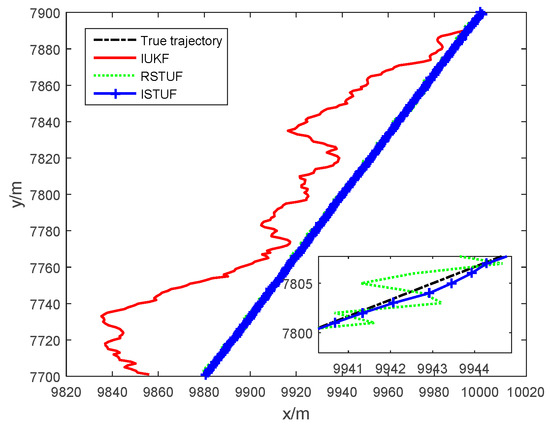 In case 2, the probability of was set as , i.e., the probability of the time-delayed measurement increased. Moreover, the noises have been enlarged. The comparison between the true trajectory and estimated trajectories is shown in Figure 5, and it is clear that the estimated trajectory of ISTUF was closest to the real trajectory. The trajectory of IUKF has been divergent, because of the effect of heavy-tailed noise.