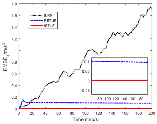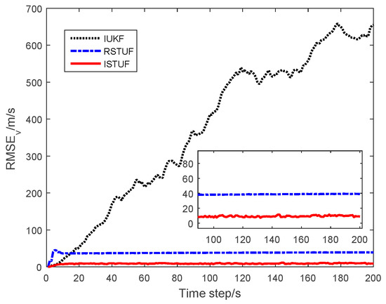 The probability of was set as . The maneuvering target was estimated for by IUKF, RSTUF and ISTUF. The root mean square errors (RMSEs) of the estimation results were used as the testing standard of estimated accuracy, which were computed by 100 Monte-Carlo (MC) runs.