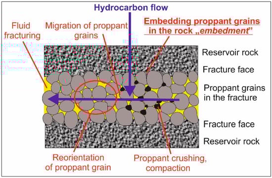 Numerous fractures and cracks created in shale formations are characterized by low width and large values of the stimulated reservoir volume (SRV). It must also be pointed out that a proper selection of the proppant should ensure high conductivity of the whole generated system of fractures distributing the proppant to the furthest parts of the fractures [11,16,17]. Apart from the way by which the proppant is transported and placed in the fractures, the phenomena presented in Figure 2 have a significant influence on the effective packaging of fractures with the proppant [10,17]. This occurs after the treatment, when compressive stress closes the fracture on the proppant.