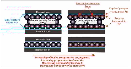 The proppant embedment phenomenon presented in this model causes the decrease of the width Wf of the created fracture (Figure 3) [7,10,18,19,20,21] and an increase in the damage of the fracture face, which results in a decrease of its permeability and conductivity [22,23,24,25].