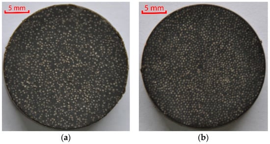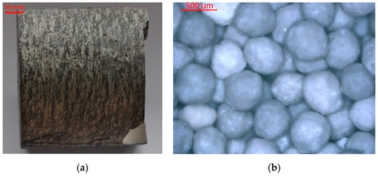 Shale rock (Figure 4a) containing 47.7% of clay minerals was used for testing. The content of quartz amounted to 24.4%, that of carbonates to 14.2%, and that of other components to 13.7%. A lightweight ceramic proppant 30/50 mesh (Figure 4b) with a grain size from 0.600 to 0.300 mm was used as the proppant material. The mean diameter of the proppant grains was 0.450 mm. The roundness and the sphericity of the grains was 0.9, the bulk density was 1.51 g/cm3.