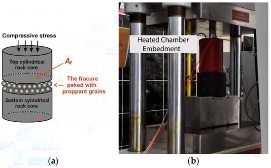 Test unit: (a) Arrangement of cores and proppant into the chamber; (b) Hydraulic press with heating chamber for the simulation of the embedment phenomenon.