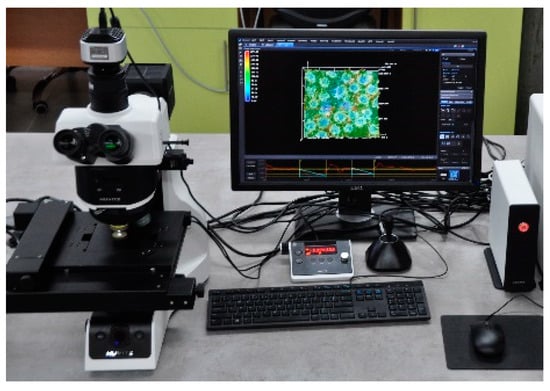 The tests were performed on cylindrical core plugs with a diameter of 2.54 cm. Firstly, the average primary roughness Ra of the entire surface of the core plug face (for the top and bottom fracture face), presented in Figure 7, was determined according to the test procedure described in the previous part of the paper. It was determined as an arithmetic average of two selected areas on the face of the tested core plug, from one profile running across the tested area. These tests were performed using an optical microscope (Figure 8), and the results are presented in Figure 9 and Figure 10.