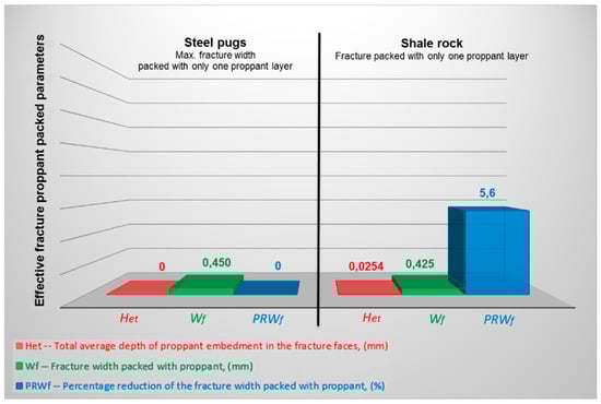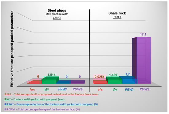 The uncertainty of the estimated width of the fracture packed with proppant was determined on the basis of the accuracy of the LVDT fracture gauge +/- 0.001 mm. The uncertainty of the estimated total average depth of proppant embedding in the fracture faces was determined on the basis of the standard deviation from the average value. The parameters of the fracture effectively packed with the proppant are presented in Figure 14.