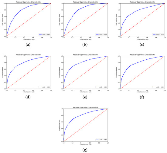 ROC curves obtained using each measures to predict the accuracy on the CIFAR validation set. Measures e, s, , g, , and are, respectively, plotted in (a–g).