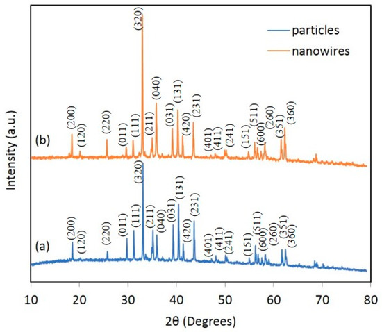 X-ray diffraction instrument (XRD) patterns of (a) irregular-shaped CaMn2O4 particles, and (b) CaMn2O4 nanowires.