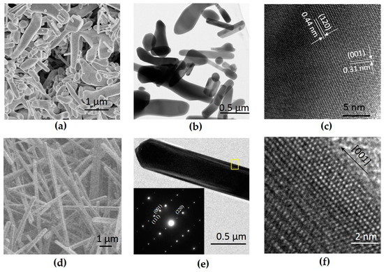 Figure 2 shows a typical SEM and TEM images of CaMn2O4 powders. The CaMn2O4 powder made by mechanochemical processing were irregular in shape with sizes from 200 nm to 2 µm (Figure 2a,b). The large particle sizes can be attributed to the higher temperature required to decompose the carbonate precursors. As evidenced in Figure 2c, irregular-shaped CaMn2O4 particles showed high crystallinity with clearly distinguished lattice fringes. The CaMn2O4 powder made using the hydrothermal method had wire shapes with diameters of ~500 nm and varying lengths (Figure 2d,e). The inset in Figure 2e shows the electron diffraction pattern of the wires, from which the growth direction of nanowires was identified as [001] (Figure 2f). The BET surface areas of the irregular-shaped powder and nanowire powder were 4.7 m2 g−1 and 5.4 m2 g−1, respectively.