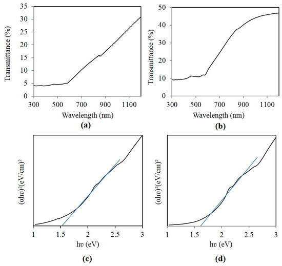 Transmittance spectra of (a) irregular-shaped CaMn2O4 particles and (b) CaMn2O4 nanowires; Tauc plots of (c) irregular-shaped CaMn2O4 particles and (d) CaMn2O4 nanowires.