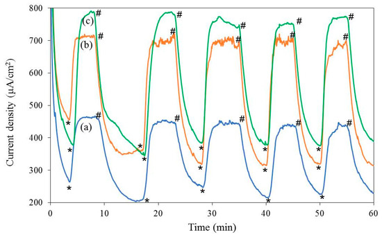 Chrono-amperograms at 1.00 V (vs Ag/AgCl) in 0.2 M Na2SO4 (pH 12) over 1 h of operation, with and without light illumination (0.25 sun), of Fluorine doped tin oxide (FTO) glass slides coated with thin films of: (a) polypyrrole only (control), (b) polypyrrole containing irregular-shaped CaMn2O4 particles, and (c) polypyrrole containing CaMn2O4 nanowires. (* = ‘light on’, # = ‘light off’).