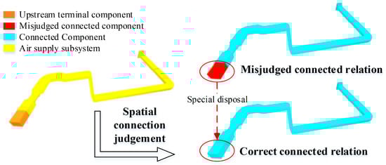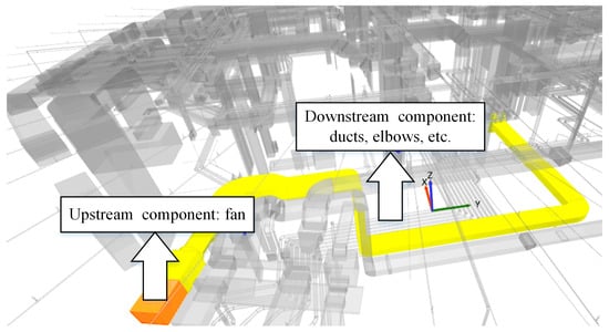 Although the actual relationships between components can be highly complex, the relationship in the user-defined identification rules considered by the algorithm is either “UpstreamOf” or “DownstreamOf”. The upstream and downstream relationships are not interconnected in space, unlike the functional relationships. For example, the valve as a logic upstream component controls its downstream components, such as pipes, and the axial fan as an upstream component will affect the working state of its downstream components, including outlets.