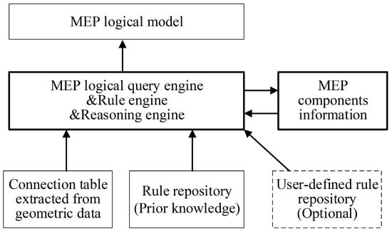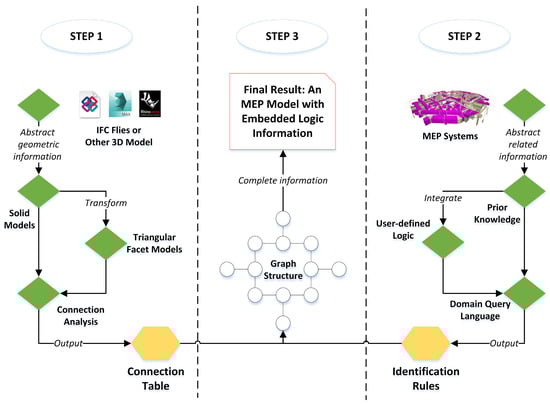 The approach consists of three steps which focus on the geometric information of MEP models, identification rules for logic inferences and the data structure of MEP components, respectively. The assessment of IFC-based spatial relationships is mainly based on 3D solid models or triangular facet models. The identification rules of MEP systems contain typical prior knowledge and user-defined logic rules. After determining the connection table, classification rules, and the terminal component, the graph data structure can be generated to represent the relationships between MEP components. Finally, the logic is generated by performing traversal searching for each connected pair of components with an appropriate identification rule.