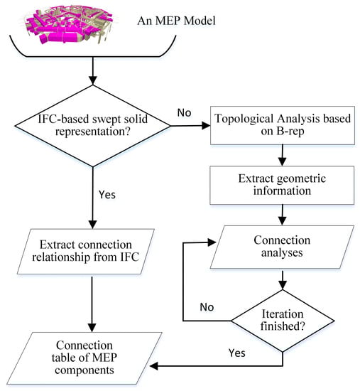 The spatial topology analysis relies on the geometric information of the MEP model. IFC can describe spatial topology objects, such as ducts and pipelines, as well as abstract concepts, such as spaces, organizations, relations, and processes []. For BIM applications in the O and M phase an extension of IFC that includes FM related information and repair information of MEP assets [,,]. has been established. IFC-based BIMs can store various types of geometric data. Conventionally, the 3D object is identified as either a surface model or a solid model in the BIM. The solid model can further be divided into swept solid and CSG (constructive solid geometry) representations. Apart from geometric property of objects, 3D models need spatial relations (or topological relations) of components to facilitate complicated analysis and decision-making, e.g., building object classification []. Existing BIMs can be directly used to estimate spatial relations between 3D objects for spatial queries or further analysis. Some algorithms [] have been proposed to automatically suggest topological relationships of building components from 3D CAD (Computer Aided Design) models. Generally, existing analytical BIM studies focus on information extracted from completed 3D models []. Particularly, based on the representation of 3D objects, the following topological relations were computed: adjacency, separation, containment, intersection, and connectivity. However, they are still limited in the cases of simple building configurations. Topological [] and directional [] relations can also be extracted from an IFC-represented BIM. Other proposed method can estimate topological relations for spatial queries based on boundary representations (B-rep) of BIMs []. B-rep is the most common surface-based representation, in which a shape is described by a set of surface elements (its surface boundary) along with connectivity information to describe the topological relationships between the elements. Previous works mainly focus on the architecture elements, such as the space, wall, and so on. However, most MEP components are represented in line structures such as air ducts and pipelines, which means topological analysis can be optimized with its specific swept solid representation. Different from the aforementioned work, this paper explores methods to complete the spatial relations (especially connections in MEP system) relying on both B-rep and swept solid represented models to improve the efficiency and accuracy of topological information generation.