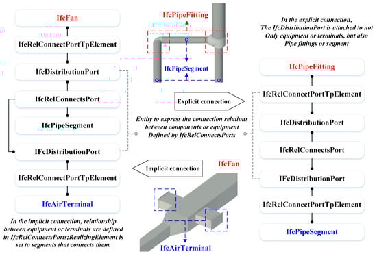 There are two descriptions of connective information in MEP subsystems, implicit connection and explicit connection. For implicit connection, IfcDistributionPort only relies on the MEP equipment or terminal component. If these two equipment or terminals are connected, they are defined in IfcRelConnectsPorts and then the RealizingElement attribute value of the relationship is set to pipe fittings or segments that connect them while, in the explicit connection, the IfcDistributionPort is attached to not only equipment or terminals, but also pipe fittings or segments. The equipment and terminals must be connected via the IfcRelConnectsPorts with pipe fittings or segments that connect them, ignoring the attribute value of the RealizingElement.