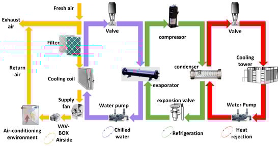 In each MEP system, countless components formulate a logic web with intertwined relationships. Taking HVAC system as an example, it consists of several circles with different functions. As shown in Figure 6, in most cases, an HVAC system with a chilled water air-handling unit is a common design for general commercial buildings or office buildings. In such a design, the supply air of each floor comes from its engine room, where the air-handling unit consists of cooling coils, filters, and supply fans. The chilled water in the frozen coil is provided by the central chilled water plant in the building and releases heat by cooling tower heat rejection. The cold air produced during refrigeration is circulated to each room by cooling water. The entire system consists of relevant equipment and various types of pipelines and valves. Chillers and air-handling units can be viewed as a whole ignoring their internal logic. Considering the practical requirements of FM and the characteristics of existing HVAC control systems, the upstream and downstream logics between ducts or pipes play important roles in emergency management. For air circulation, the fan can be taken as the ultimate upstream terminal and its downstream components involve the damper, duct and air terminal box. Similarly, an evaporator cooler can be regarded as the upstream terminal component of the water circulation, and its downstream components involve the water pump, valve, and pipe.