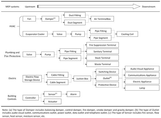 Building information modeling/model (BIM) technology has been heralded as a facilitator to improve the FM efficiency by integrating the FM related information []. The application of BIM to FM is beneficial because it provides FM personnel with the opportunity to manipulate and utilize the information associated with the 3D objects and, thus, FM tasks can be conducted in a more scientific, reasonable, and orderly way []. These improvements are accrued during the generation and management of facilities’ digital specifications and characteristic data []. Nevertheless, although the BIM technology enables data integration within the building lifecycle, incongruence between the supply of and demand for has also proved that insufficient valuable information is considered one of the key obstacles of BIM-based FM []. A survey demonstrates that more than 80% of the FM time is consumed in finding relevant information that is often disregarded by designers []. Enriched as-built BIM delivered to facility managers can save time for information acquisition, thus, it is suggested that the logic tree of the objects should be implemented to facilitate the management of various components within the MEP model []. However, manually setting up the logic chain of the MEP components requires tremendous workloads []. Hence, a unified logical information rule is necessary to build an accurate MEP logic tree, which benefits not only the operation and maintenance (O and M) management but also the emergency responses associated with the specific MEP component. Substantiated by the facility managers, making use of the MEP model containing the appropriate logic information could save up to 30% work force in locating the equipment and emergency decision-making compared with the traditional MEP database [].