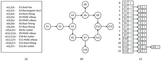 Data structure of MEP subsystem’s components. (a) Connection table for illustrating topological relationships. (b) Graph structure of the MEP subsystem. (c) Inverse adjacent list of MEP components.