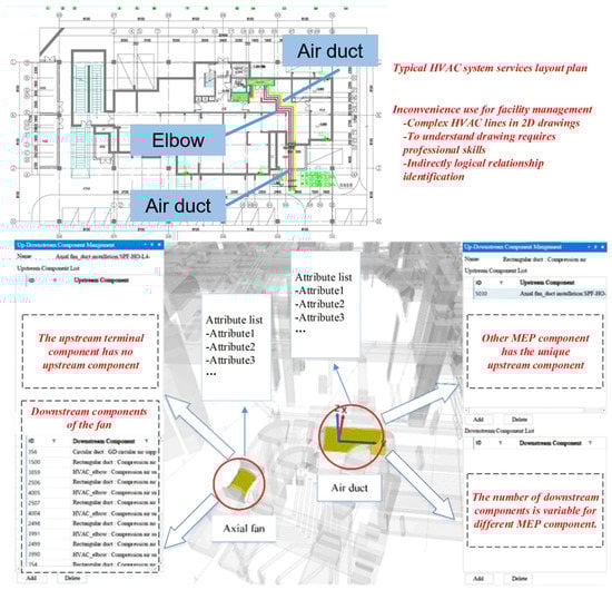 Obtaining the upstream and downstream elements is inconvenient with complex HVAC lines in 2D drawings and requires professional skills. The large size and dual-line representation of the air duct and equipment result in such congested drawings. The bottom half of Figure 11 shows a system logic representation of an HVAC subsystem. The duct fittings and equipment are denoted by 3D models to identify their location and connectivity. When considering BIM integrated with logic information, the MEP models provide the upstream and downstream component list of selected nodes. In user interface, the logic management panel provides the upstream and downstream component list of selected nodes. The downstream list of axial fans includes several ducts, elbows, fire dampers and transitions; meanwhile the upstream component of the duct is the axial fan. There is only one upstream component for each MEP component except for the upstream terminal one. Thus, the axial fan has many downstream components but no upstream components, and the duct has an upstream component but no downstream component.