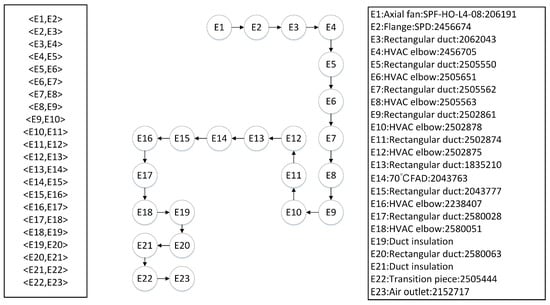 After generating a directed graph of the MEP subsystem, the breadth search for the directed graph will be performed with each identification rule to append the MEP logic information. The semantic analysis of identification rules will output the requirements of the upstream and downstream components, including the entities, properties, relationships and operations. The search sequence of Figure 9 Note (b) is E1, E2, E3, E4, E5, E6, E7, E8, E9, E10, E11, E12, and E13. For each component meeting the downstream component requirements, the first satisfying upstream component of the same rules searched in the reverse direction of the graph will be defined as the upstream component, and the logic information will be added to the model. An enriched MEP information model with a logic chain can then be generated when the entire subsystem completes the traversal of all identification rules. In this example, the fan is the upstream component of the duct and the duct is the upstream component of the air terminal box. An inspection of the components according to the first rule indicates that E2, E3, E4, E5, E6, E1, E7, E9, E11, and E12 are the downstream components of E1. When considering the second rule, E8, E10, and E13 should be the downstream components of E6, E7, and E12, respectively.