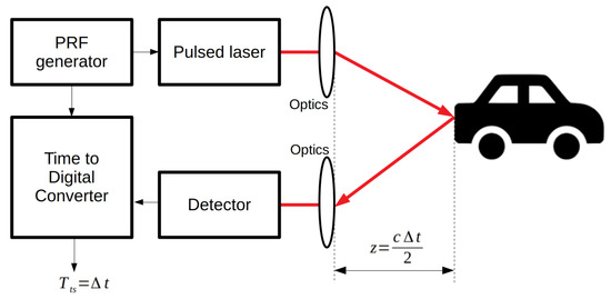 Single-photon detectors such as single-photon avalanche diodes (SPADs) are used on the receiver side to detect the time of arrival of individual photons. Photoelectrons generated by the absorption of individual photons are accelerated by the strong electric field in the diode and undergo an avalanche multiplication process that produces a macroscopic, measurable current through the device [10]. Events detected by the SPAD pixels are often timed on-chip using combinations of time-to-analog converters (TACs) and analog-to-digital converters (ADCs) [11,12], or time-to-digital converters (TDCs) [13,14,15], to produce a digital representation of the time of arrival of each detected photon, called a timestamp. Each timestamp is a measure of the time of arrival of a photon detected by the pixel relative to the generation time of the laser pulse , according to the relation