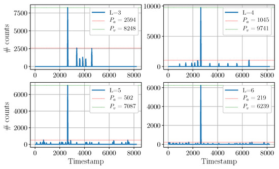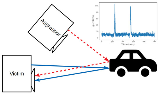 The worst possible case for a TCSPC LiDAR victim is to operate in an environment with an aggressor that uses the same functional parameters (emission wavelength, pulse repetition frequency, and pulse duration). In this case, the photons of the aggressor will appear as correlated to the victim. The corresponding pixel events will build up in a second histogram peak with an unknown delay that is dependent on the phase shift between the PRFs of the two devices and the difference in length between the victim–target–victim and aggressor–target–victim optical paths.