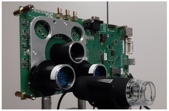 The experimental setup is based on a custom-designed field-programmable gate array (FPGA) board (Figure 5) equipped with a custom SPAD sensor with on-chip TDCs (center) and four independent pulsed VCSEL array illuminators, two of which (lower left and lower right) were used in this work. A conventional webcam has been added to the setup to simplify the optical alignment.