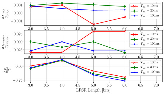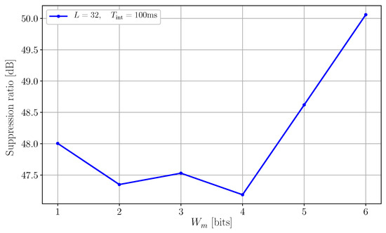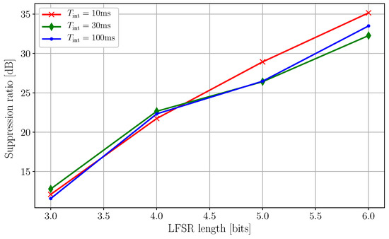 It is shown that the suppression ratio improves with the increasing length of the LFSR, reaching a maximum measured suppression of using complete sequences. This is expected, as longer LFSRs produce longer sequences with a larger set of delay steps. The suppression appears to be worst for short LFSRs and long integration times. This occurs when , where is the length of the m-sequence generated by the LFSR of length L, is the system clock frequency, and is the integration time. In this case, the repetition of the same pseudorandom sequence of delays during the same acquisition introduces deterministic systematic patterns in the scrambling of the aggressor.