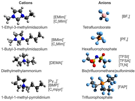 In general, ionic liquids are defined as liquids that are composed entirely of ions []. This definition includes melts of crystalline ionic materials, which are commonly referred to as “molten salts”, as well as mixtures of any type of ions in the liquid state. In a narrower sense, “room-temperature ionic liquids (RTIL)” are understood as salts, which often contain organic ions, with melting points below room temperature [,]. Starting from their first discovery in 1914, they have become of central interest in fundamental and applied chemistry in recent decades, mainly because they are considered as promising alternative environmentally-beneficent solvents []. As their properties can be as systematically tailored as both their constituents, anion and cation, can be varied, they have been labelled “designer solvents” []. In general, ionic liquids provide a variety of desirable characteristics for chemical engineering, such as a high chemical and thermal stability, a high ionic conductivity, a negligible vapor pressure, and low flammability []. Potential fields of application comprise not only all techniques of chemical synthesis and processing where conventional molecular solvents are employed, but also mechanical engineering where ionic liquids may serve as lubricants and coatings []. Moreover, they have attracted enormous attention in electrochemistry, as they can be used as stable electrolytes for sustainable energy storage and conversion by supercapacitors, batteries, dye-sensitized solar cells, or polymer electrolyte membrane fuel cells (PEMFCs) []. As an illustration of the composition of ionic liquids, selected cations and anions are presented in Figure 1.