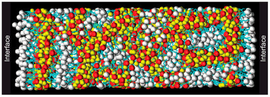 Figure 2 depicts a snapshot of such a simulation, making the aggregation phenomenon in the bulk visible. Comparing cations with different tail groups, Wang et al. [] concluded that the tendency for building heterogeneous bulk structures increases with the length of the alkyl chains, which can explain many macroscopic properties such as diffusivity and viscosity. Not only does this hold true for the cations, but it was also found that asymmetric anions with extended alkyl chains can be the cause of nanostructurization and domain formation. This opens up the opportunity to tailor ionic liquids with specific macroscopic properties by changing the configuration of their base ions [,]. Depending on the specific geometry of the ions, a variety of complex bulk structures can be adopted, e.g., for the protic ionic liquid ethylammonium nitrate (EtNH3NO3), a defined structure composed of cationic layers with the anions distributed in between the layers as well as being intermixed with the cationic layers was proposed [].