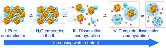 In general, the addition of water to an ionic liquid can be divided into different steps, as elaborated by Ma et al. []. This scheme is illustrated in Figure 3. With small water contents, an embedment of water in the ionic liquid nanostructure can be established without clustering effects and thus this stage can be described as the solvent mixture (step II). With increasing water content, the ordered structure of the ionic liquid gets distorted and the dissociation and hydration occurs such that individual ion pairs can evolve (step III). Finally, at high water concentrations, a complete or partial dissociation and hydration takes place (step IV) and thus the mixture can be treated as a classical electrolyte. Depending on the individual properties of the ions, the solution of the ions in the water can also be related to the formation of micelles []. This has been studied in detail with ionic liquids containing the 1-alkyl-3-methylimidazolium family of cations and it has been found that the micelles formation can accelerate specific chemical reactions, thus showing potential for the practical application of ionic liquid-water mixtures in catalysis [].