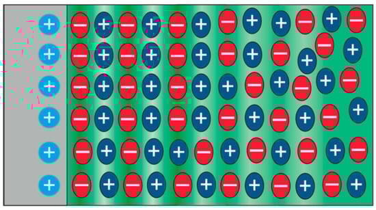 As ionic liquids are entirely composed of ions, one can assume in a simplified approximation that ions with a charge opposite to the electrified electrode will be attracted to the interface. As illustrated in Figure 5 for a positive electrode, the first layer would be formed by anions, followed by a cation layer. Depending on the strength of the coulomb interaction, this layering will be repeated towards the bulk several times. With increasing distance from the interface, the disorder will decrease until, finally, the bulk structure is adopted. In ionic liquids composed of asymmetric ions, the orientation of the molecules also becomes relevant, and the interaction between charged head groups and uncharged tail groups can result in complex field-induced charge arrangement processes [].