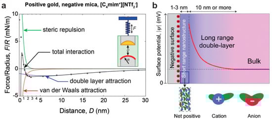 (a) SFA measurement of [C4MIm] [NTf2] sandwiched between Au and mica; (b) resulting model of the electric double layer. Adapted from Gebbie et al. [].