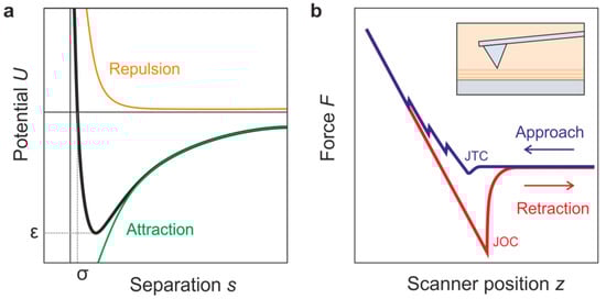 Theoretically, the interaction between the tip and a solid surface can be approximated by the Lennard–Jones potential ULJ (see Figure 7a), which was calculated by a two-atom approach. It includes an attractive van der Waals interaction and a repulsive interaction related to Coulomb forces and the Pauli Exclusion Principle: