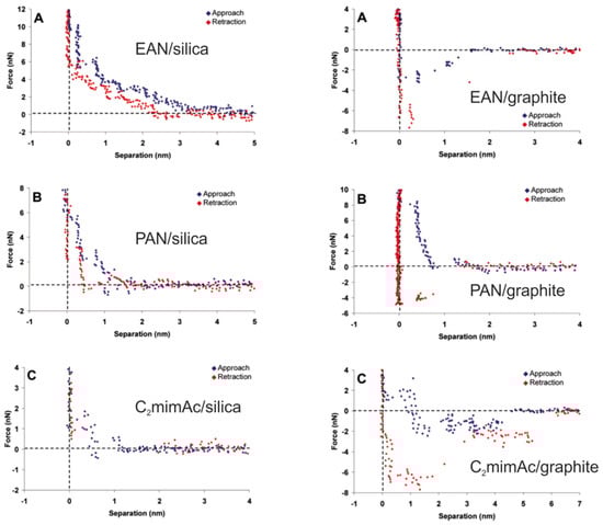 Force–separation curves measured on the silica surface (left) and the graphite surface (right) using three different ionic liquids, EAN (A), PAN (B) and C2MImAc (C). Adapted with permission from Atkin and Warr []. Copyright 2007, American Chemical Society.
