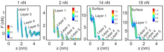 As the mechanical measurement of layered interfaces is prone to fluctuations, it is useful to not measure only one but a set of several tens of force curves (as drawback information about dynamic effects, which are often investigated in biological AFS, gets lost). Subsequently, their average can be calculated and presented using 2D histograms, as is shown for the [EMIm][TFSI]/mica interface in Figure 9. Four series of measurements obtained using different set points of maximum force are presented, illustrating a major challenge when performing AFS in liquids. Due to the calculation of the separation via the cantilever deflection (Equation (3)) and the increasing hardness of layers when approaching the surface, it is demanding to determine the point of zero separation, which denotes the point when the tip is in direct contact with the surface []. In all measurements, the layered interface structure of the ionic liquid can be clearly observed, but when choosing too low of a set point, the real surface cannot be reached. This also constitutes a requirement on the cantilever selection. Using a soft cantilever with a low spring constant has the advantage of high sensitivity at the expense of a limit on the maximum force. Furthermore, the large deflection of soft cantilevers can result in a distortion of the force curves due to the nonlinearities of the photodetector []. Hence, one should select a cantilever that can provide sufficient force to reach the surface. In the example of Figure 9, a set point of 14 nN was needed to puncture all liquid interface layers. This was concluded by the fact that a further increase of the force set point to 18 nN did not reveal further layers. An additional indication for hitting the surface can be derived by regarding the retraction curves, often showing a distinct change in adhesion after direct tip-surface contact [].