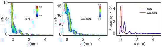 Force–separation curves and separation histogram measured during approach of the [EMIm][TFSI]/mica interface using comparing a SiN and a Au-coated SiN tip. Adapted from Black et al. [].