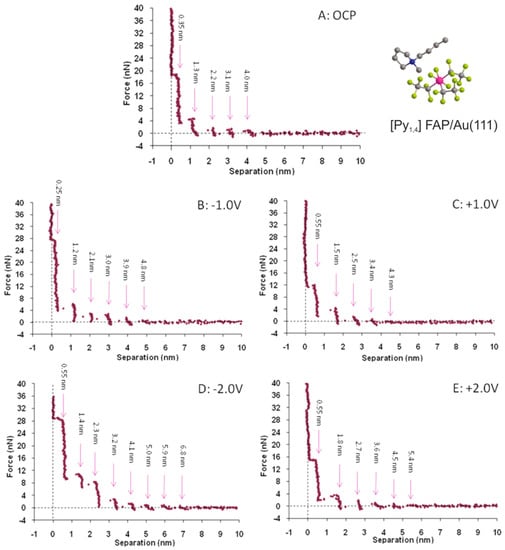Force–distance measurements on the [Py1,4] FAP/Au(111) interface at different surface potentials. Adapted with permission from Hayes et al. []. Copyright 2011, American Chemical Society.