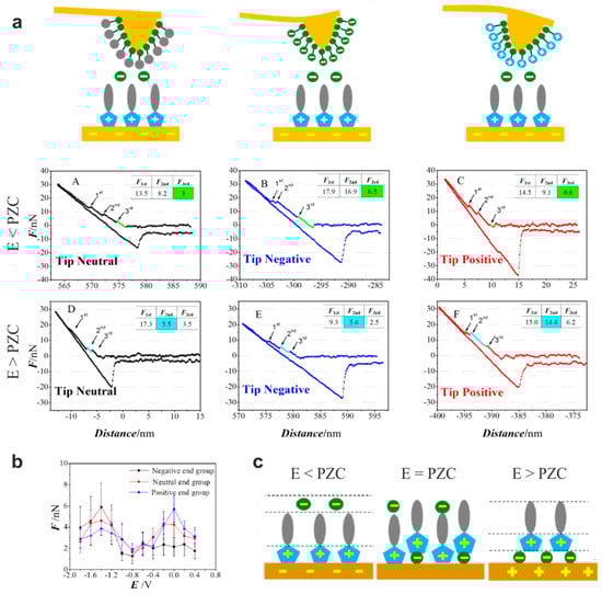 Measurement of the [OMIm][PF6]/Au(111) interface using a modified tip. (a) Force–distance curves measured at a potential (E) above and below the potential of zero charge (PZC) with molecules having neutral, negative, and positive end groups attached to the tip (the inset tables display the force necessary to rupture the first, second, and third layer); (b) force necessary to rupture the third sublayer measured at different potentials applied to the surface; (c) model of arrangement of the ionic liquid at the interface depending on the potential. Adapted from Zhong et al. [].