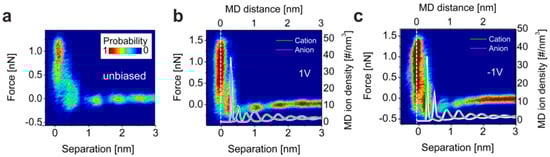 Aside from the aforementioned investigations of the electrified Au surface, studies of the interface between ionic liquids and graphite have been conducted, as the understanding of carbon-based electrodes is of high significance for building fuel cells or electrochemical supercapacitors []. Black et al. [] focused on the interface structure between 1-ethyl-3-methyl-imidazolium bis(trifluoromethanesulfonyl)imide ([EMIm][TFSI]) and highly oriented pyrolytic graphite (HOPG). The measured 2D force–separation histograms are presented in Figure 13 for the unbiased and positively and negatively polarized surface. In all cases, an ordered structure with up to four layers has been revealed. In order to gain a deeper insight into the ionic arrangement of the double layer, the measured curves were correlated with molecular dynamics simulations. The densities of anions and cations as a function of the separation from the surface were calculated from simulations performed at different surface potentials, as shown in Figure 13 for +1 V and −1 V. In contrast to the uncharged surface, where different ion orientations are present, the electrostatic force induced by the application of the potential leads to a predetermined ion orientation in the first ion layer and a charge screening confined to approximately 1 nm. Further from the surface, a layered interface structure with absent preferential ion orientation was predicted. The conclusions derived from the simulation closely match the experimental results, showing the versatility of AFS for investigating the electric double layer in ionic liquids. Jurado et al. [] extended the investigations of carbon-based materials to the graphene surface. They investigated the interface formed with [EMIm][TFSI] at zero charge as well as under applied potential, concluding that the strong interaction of the imidazolium ring with the graphene surface via π–π bonding results in a preferential orientation of the ions and to an overscreening, even on the uncharged surface. When a potential was applied, the behavior of the double layer changed from overscreening towards crowding, leading to a decrease in the force within the layered structure.