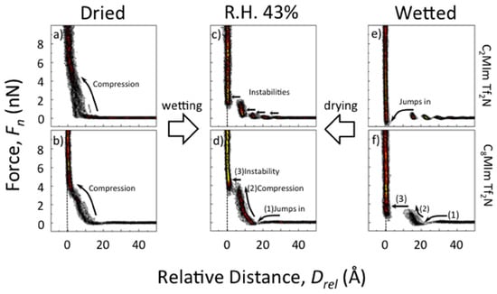 Investigation of the interface between mica and [C2MIm][TFSI] (a,c,e) and [C8Mim][TFSI] (b,d,f) using force-separation histograms at different water contents. Adapted from Cheng et al. [].