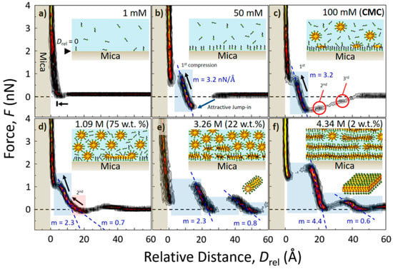AFS investigation of the interface between mica and mixtures of water with different concentrations of [C8MIm][Cl]. The force/distance slopes (m) corresponding to the stiffness of each layer are shown as blue dotted lines and the schematic structural interpretations are depicted as insets. Adapted with permission from Cheng et al. []. Copyright 2018, American Chemical Society.