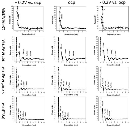 In order to simulate the interaction between solutes and ionic liquids, Hoffmann et al. [] developed a mathematical semi-continuum model based on AFS investigations of the interface between Au(111) and in [Py1,4][TFSA] with varying admixtures of Ag salt. As presented in Figure 16, a clear correlation between Ag concentration and the detected layers at the interface was observable. With increasing Ag concentrations, the widths of the layers at first increase, suggesting the presence of larger AgTFSA complexes within the double layer. Eventually, at concentrations above 500 µM AgTFSA, the ordered structure collapses into a simple double layer. The developed thermodynamic continuum model, which treats the ionic liquid as being composed of hard spheres, could be successfully applied to describe the interfacial structure under the influence of Ag additives and to simulate the force–separation curves []. To summarize the investigations of metal additives in different ionic liquids, it can be concluded that, in general, the structured interface layer becomes distorted at high metal concentrations; however, at low and intermediate concentrations, a complex interplay with the metallic species and ionic liquid takes place such that each specific combination of additives and liquids must be considered independently.