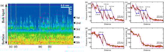 Frequency modulation (FM)-AFM investigation of the [Py1,4][FAP]/KCl(100) interface. (a) Frequency shift–distance curves measured along a distance of 4 nm; (b–e) cross-sections obtained at the lines marked in (a). Adapted with permission from Ichii et al. []. Copyright 2014, the American Chemical Society.