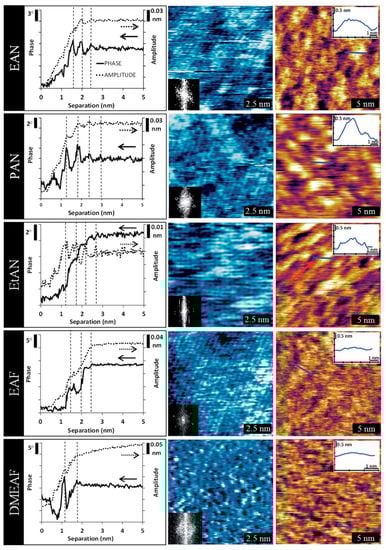 Amplitude modulation (AM)-AFM study of the interface between mica and different ionic liquids. Left: Amplitude and phase–separation curves. Right: Topographic images of the innermost (blue) and the first near-surface layer (brown). Adapted from Elbourne et al. []—Published by The Royal Society of Chemistry.