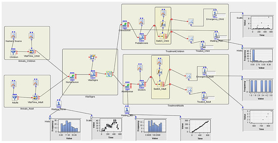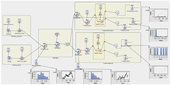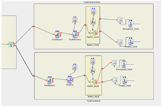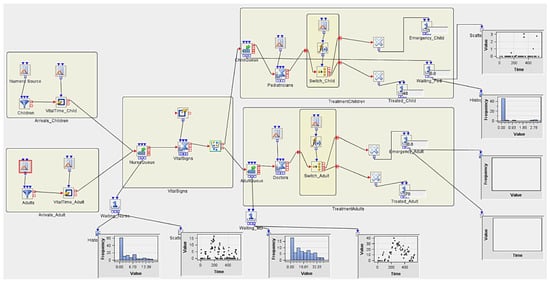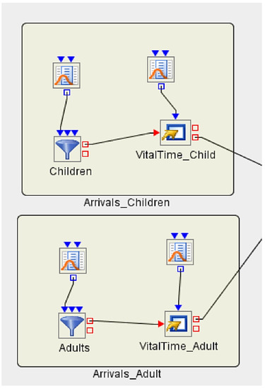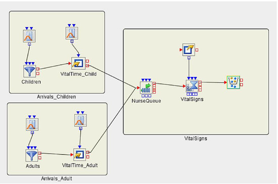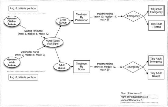 Since an urgent care clinic is equipped to treat most individuals including both children and adults, it was used for this case study. As shown in Figure 1, on a typical day, 6 child patients arrive to the clinic per hour (); and 8 adult patients (including pregnant women) arrive per hour (). All patients must wait to see a nurse for an initial vital sign evaluation (triage specialist). The time is triangularly distributed in minutes. For a patient coded as a child the minimum wait time was 5 min, the mode (most occurring time) was 8 min, and the maximum was 12 min. For a patient coded as an adult, the wait times were noted as a minimum of three minutes, mode of five minutes, and a maximum of 9 min. Afterward, there is an additional waiting period for children to see a pediatrician and for adults to see a doctor. The wait time to see a pediatrician had a minimum of 10 min, mode of 14 min, and maximum of 25 min. For adults waiting to see a doctor, the minimum was 8 min, the mode was 12 min, and the maximum was 20 min.