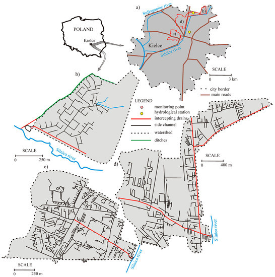 Study area—(a) location in the city of Kielce; (b) IX Wieków Kielc stormwater treatment plant (SWTP) catchment; (c) Witosa SWTP catchment; and (d) Jesionowa SWTP catchment.