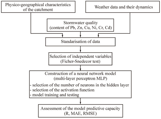 Initially, to develop the ANN model for predicting HM concentrations, the independent variables describing catchment characteristics, precipitation and weather conditions [1,3,10,22] were adopted. Prior to further analyses, those data were normalised and standardised [23]. Then, the independent variables that have negligible effect on the simulation results were eliminated from the set of potential variables using the Fisher–Snedecor test. The next stage involved the development of ANNs models—the multi-layer perceptron (MLP), and structure optimisation (conjugate gradient, gradient descent, number of neurons in the hidden layer and activation functions in the hidden and output layers) [23]. Figure 2 shows the diagram of the adopted computational procedure [24].